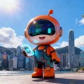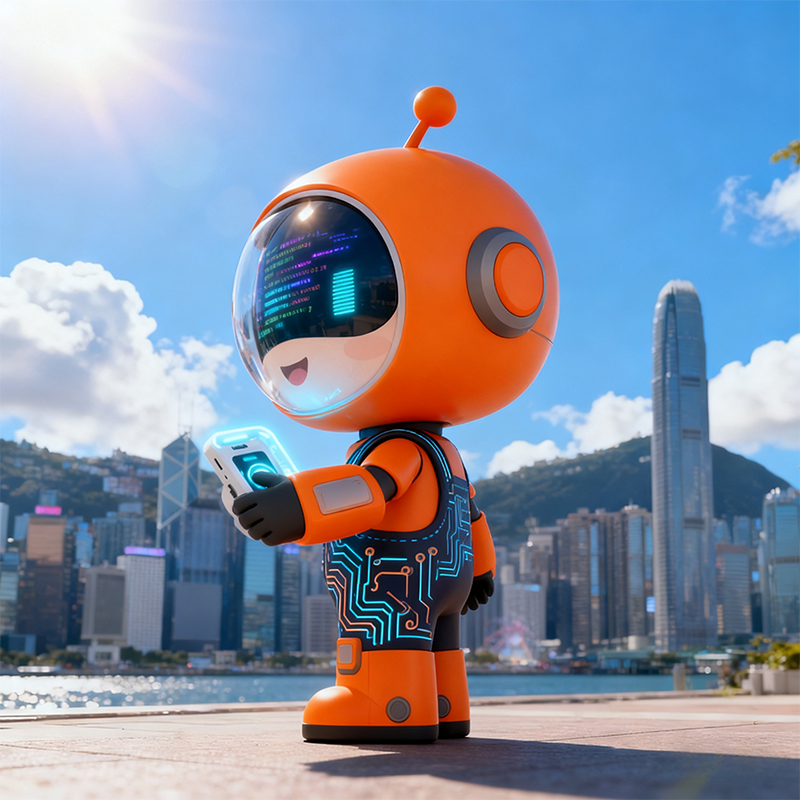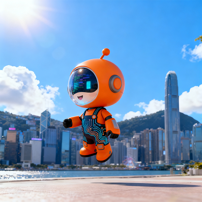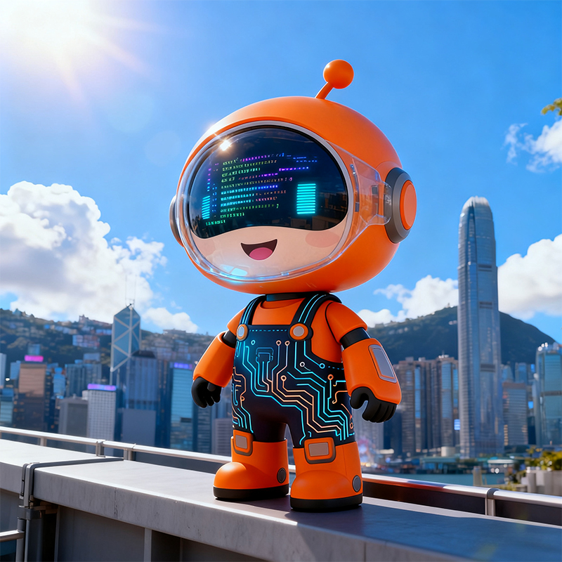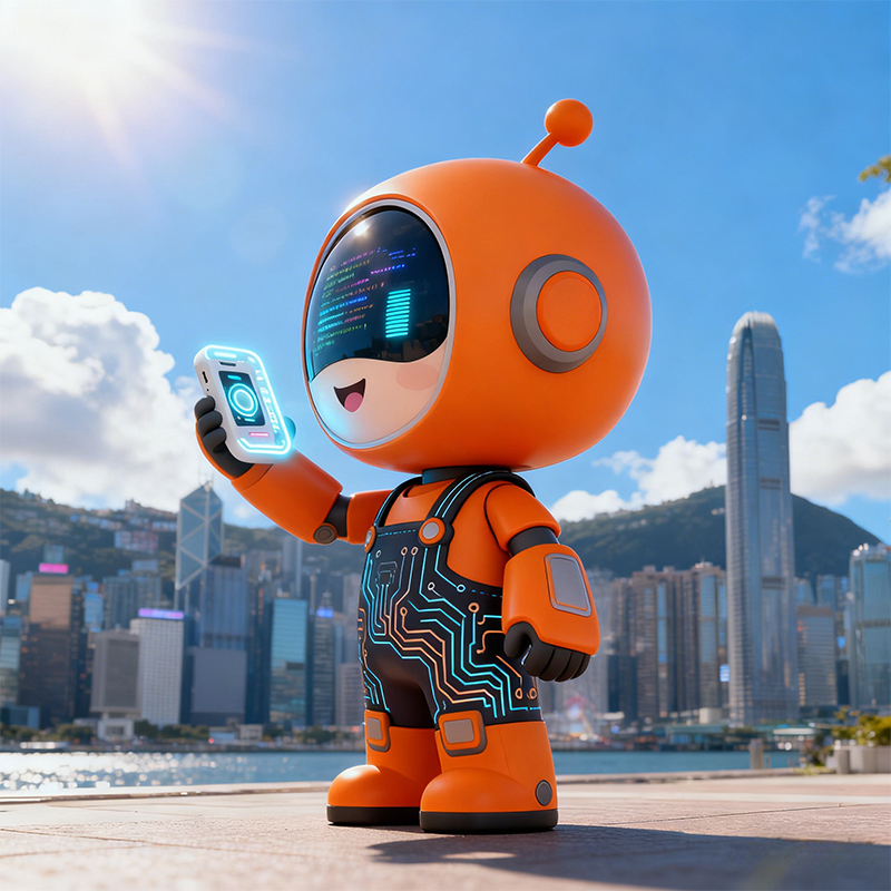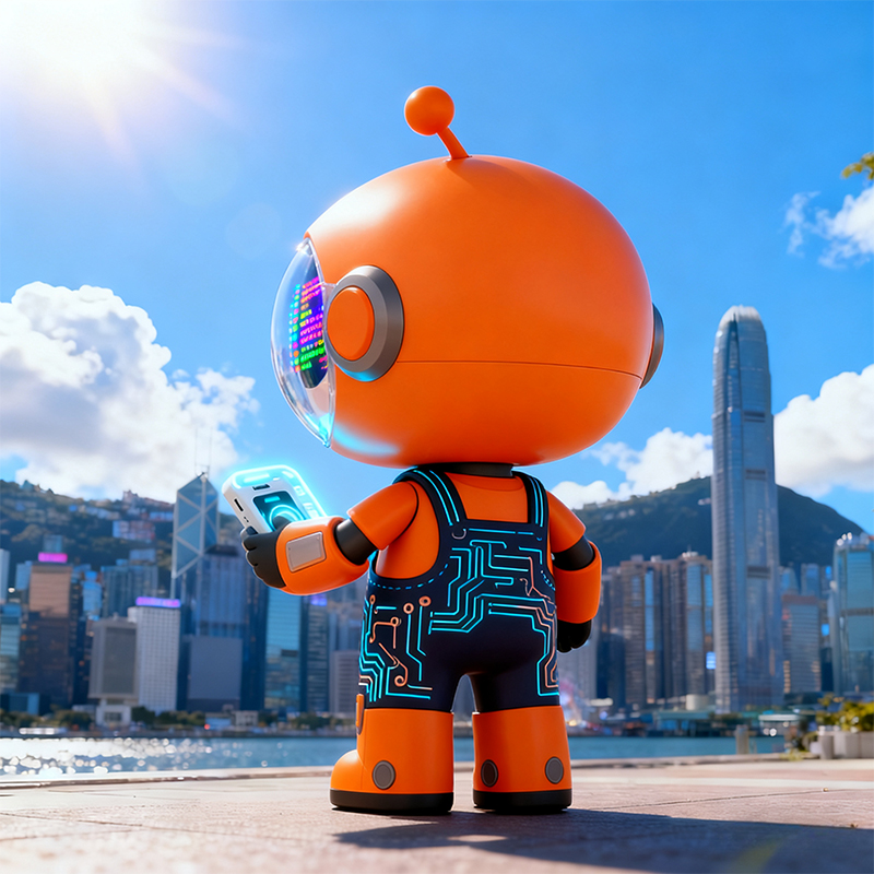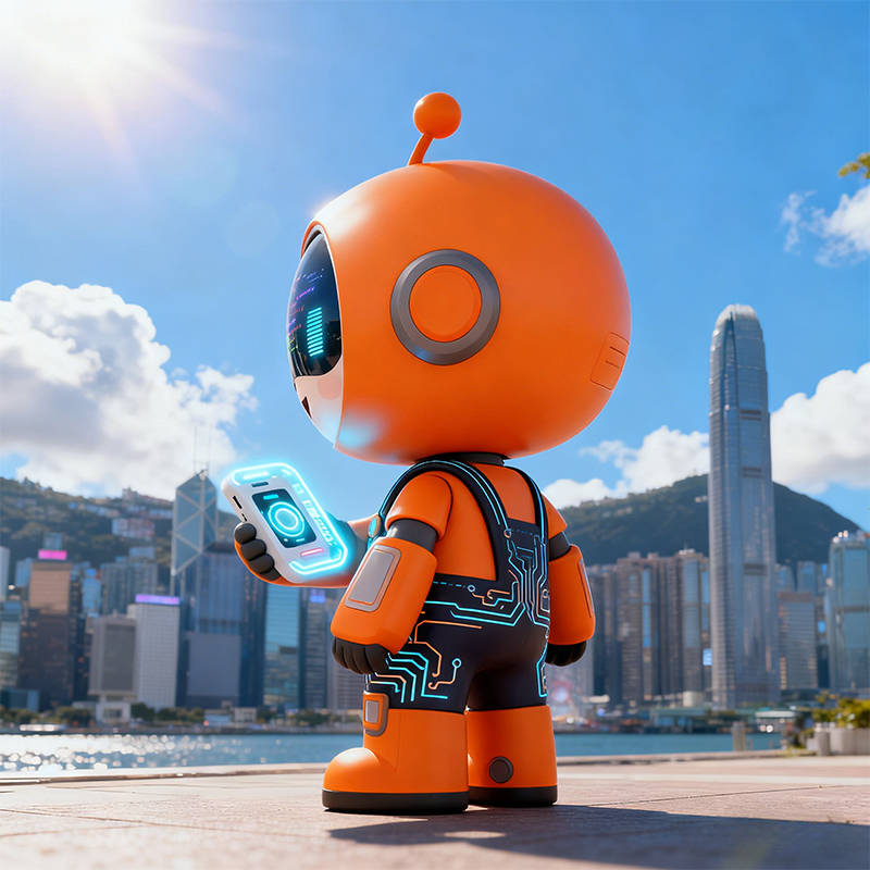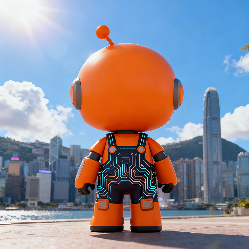 It’s a cartoon robot that perfectly blends tech and cute aesthetics: Its bright orange body comes with a natural vitality boost. The small antenna on its head and the scrolling code screen in its face shield are iconic hardcore tech details, paired with overalls printed with glowing circuit patterns. With its soft, cute smile and round figure, it instantly gives off the vibe of a "future trendy toy photo op" when placed against Hong Kong’s urban backdrop.