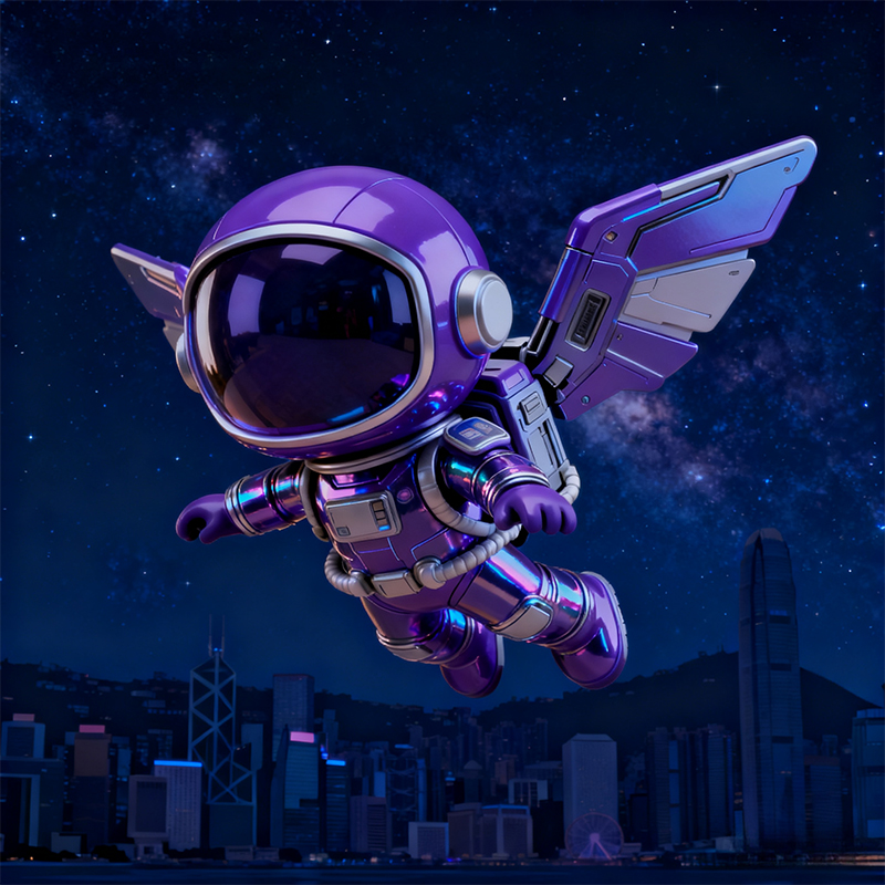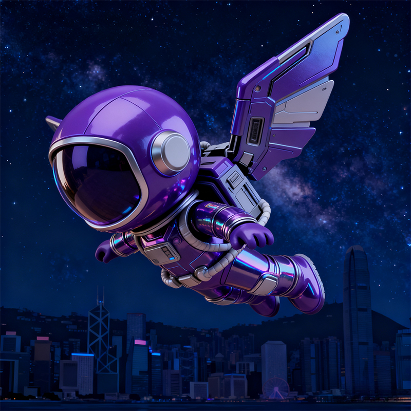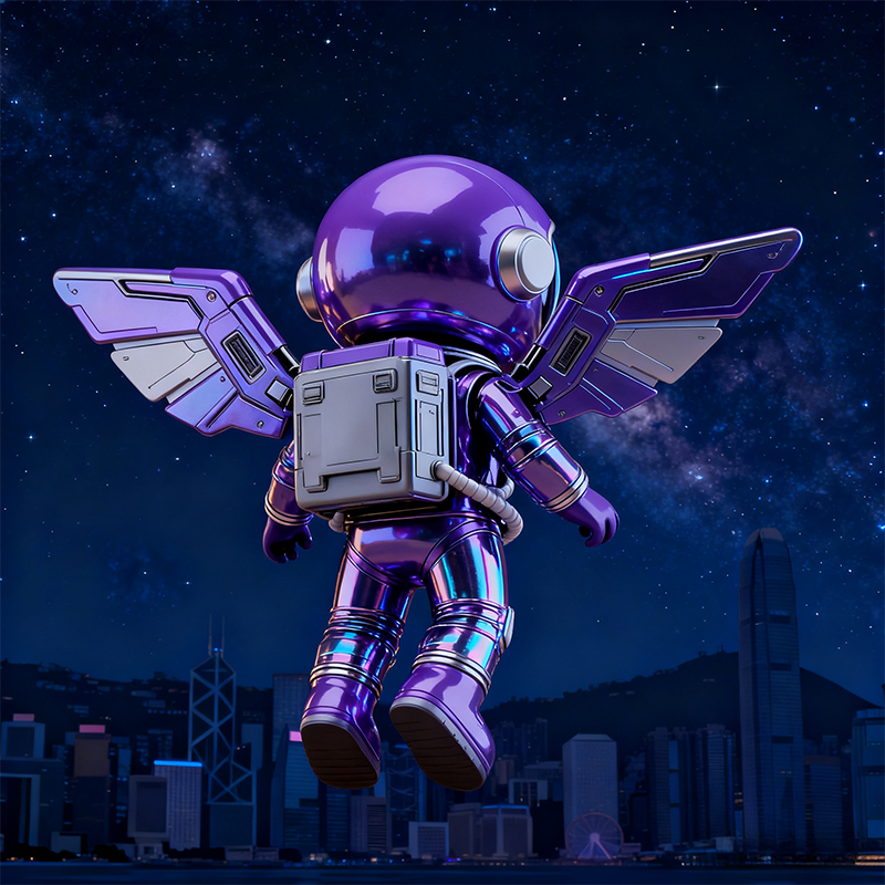 It’s the Phantom Purple Space Cutie gliding through the urban starry sky: Its purple metallic spacesuit wraps around futuristic mechanical textures, while the deployed mech wings on its back are the exclusive mark of space flight. The glossy helmet pairs with its chubby chibi-style figure — when hovering against Hong Kong’s starry urban backdrop, it’s exactly “the cute space knight of the urban night sky” — blending the hardcore vibe of space exploration with the soft, playful charm of trendy toys.