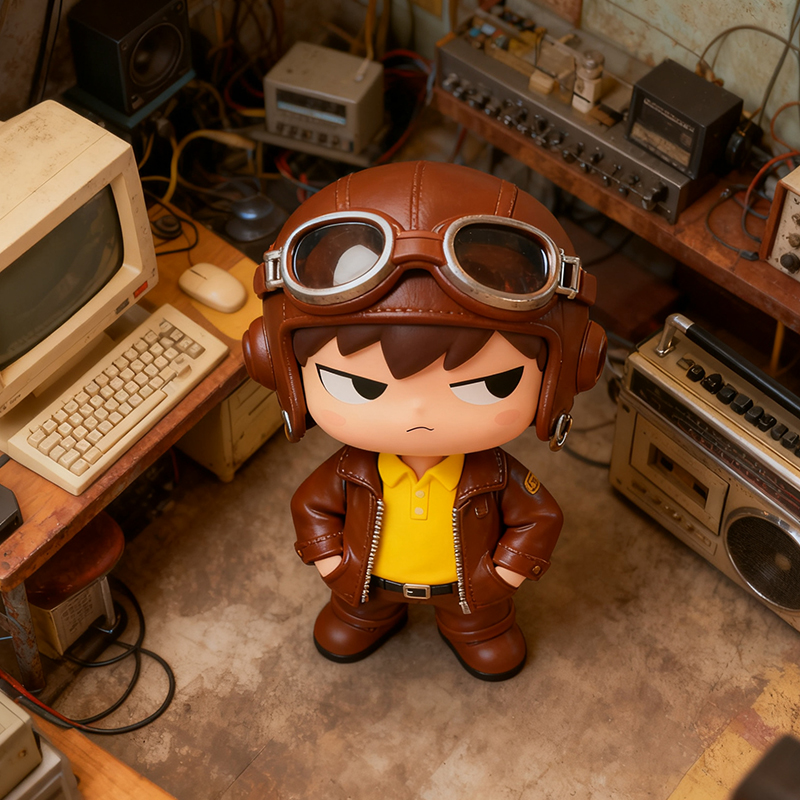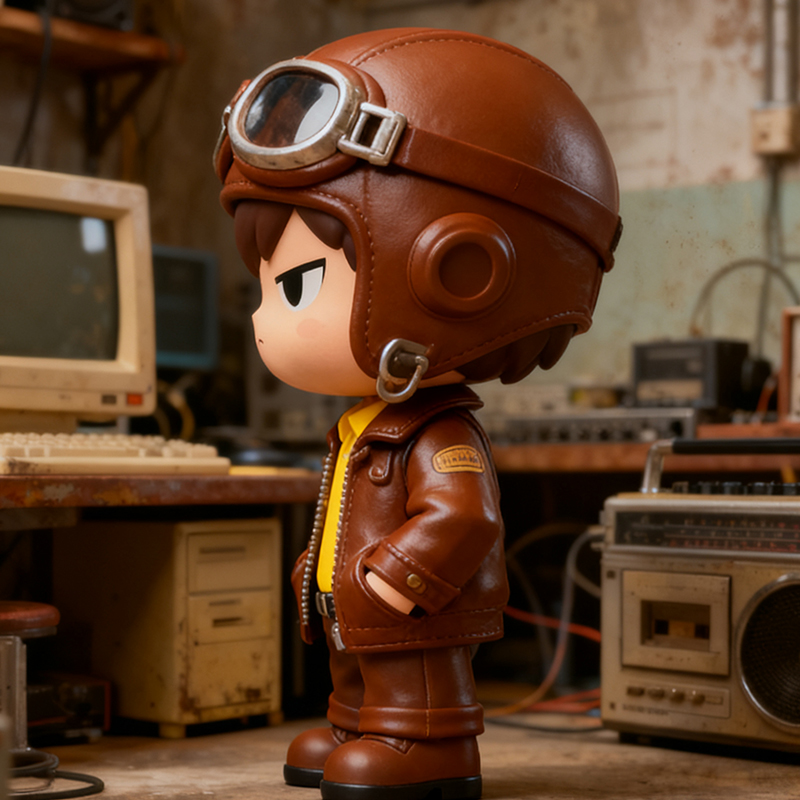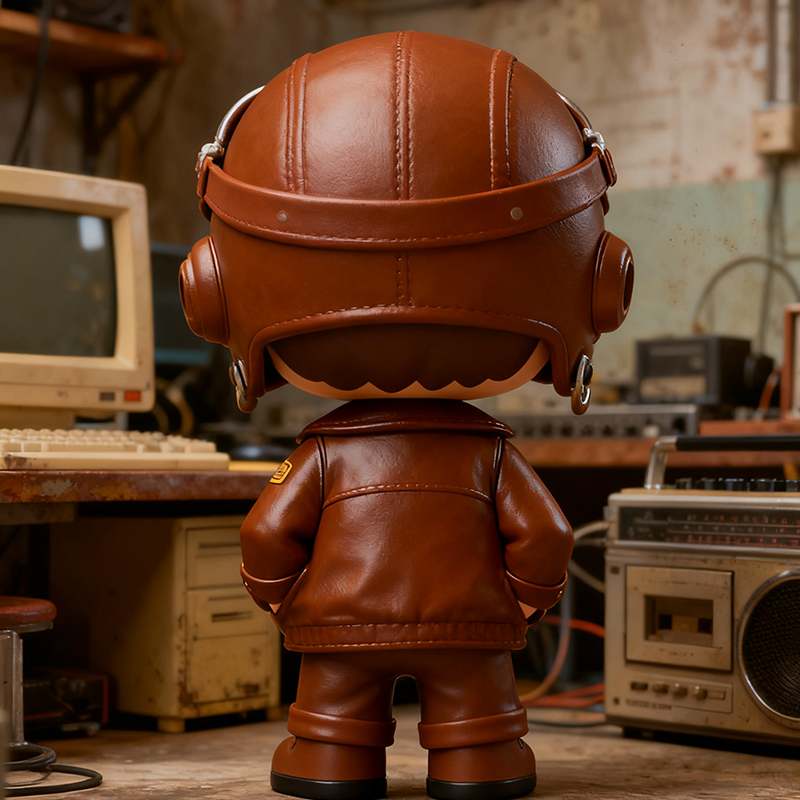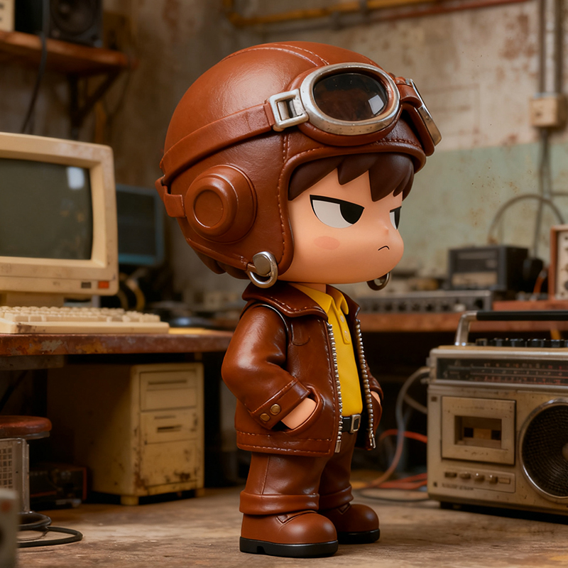 It’s a chibi-style figure leaning into the "retro cool" aesthetic: a brown faux leather jacket + pilot helmet, paired with classic goggles, plus a sassy little expression (furrowed brows, pursed lips) that creates a cute contrast. The yellow inner shirt adds a layered color scheme, and when placed in a retro industrial setting, it oozes that perfect vibe.